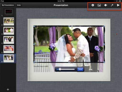 Your start off by selecting a theme, and then you import images one at a time from the Photo library of your iPad. To import images, you either select the media and tools icon in the menubar, or you select the same icon in the slide itself.