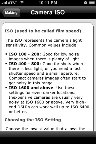 The "Making" part of the app is much better. This section includes well-written explanations for often difficult topics about photography, such as understanding exposure and metering techniques. He provides recommendations for various ISO, White Balance, aperture and shutter speed settings for different shooting situations. All the information can be found in a good photography book or on the Internet, but it might well be handy as a guide on your iPhone.